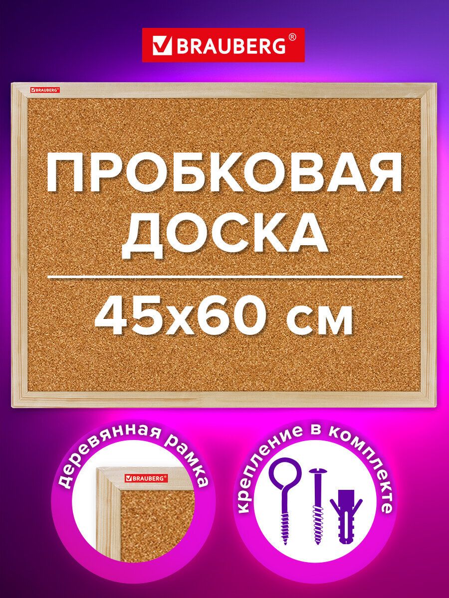 Доска пробковая информационная на стену 45х60 см для объявлений, заметок, записей и фото, деревянная рамка, Brauberg Wood