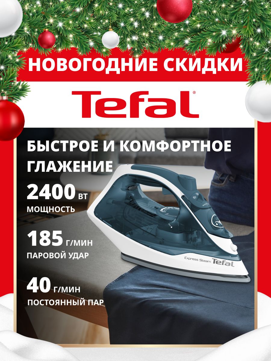 Утюг для одежды Tefal Express Steam FV2839E0 с противокапельной системой, вертикальным отпариванием, системой самоочистки, паровым, 2400 Вт, синий