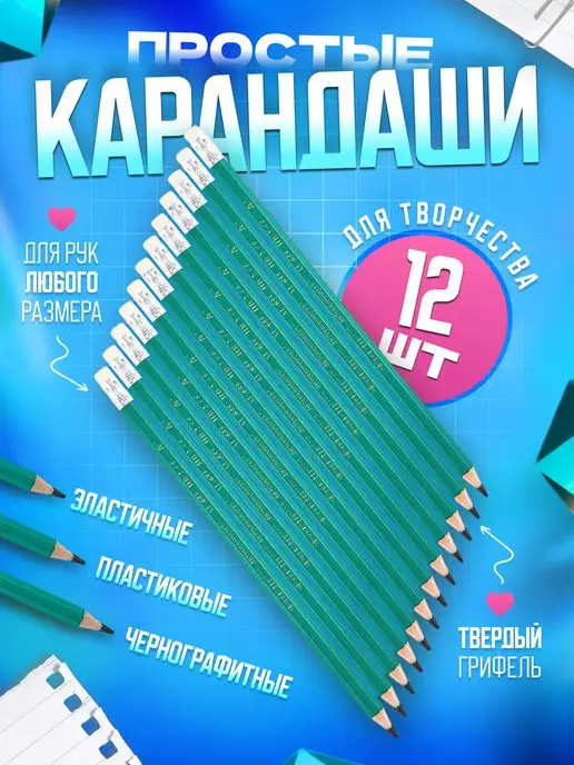 Карандаши простые чернографитные с ластиком 12 шт. HB