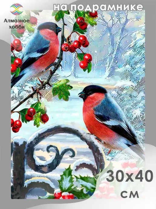 Алмазная мозаика на подрамнике Вестники зимы снегири 30х40