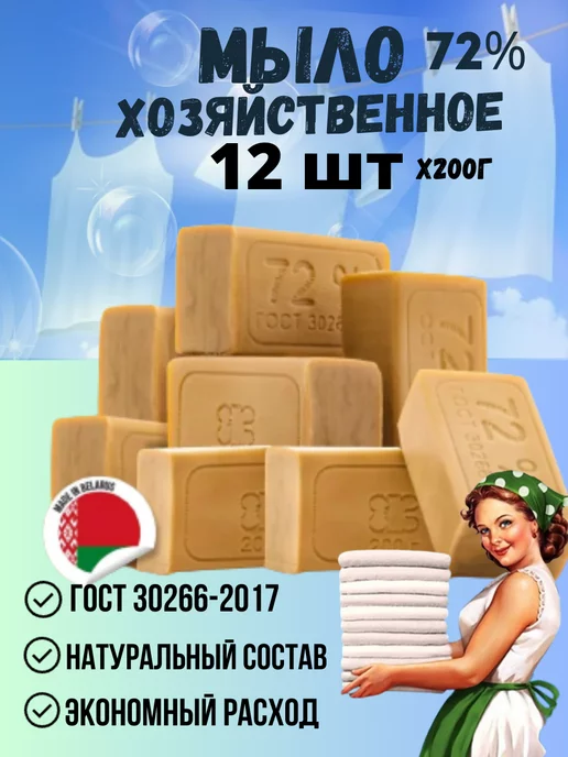 Мыло хозяйственное натуральное для стирки 72% гост 12 шт